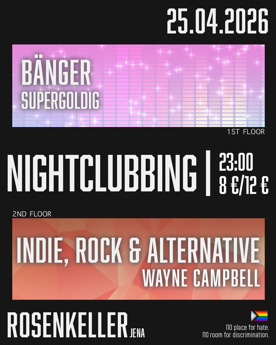 Rosenkeller Johannisstraße 13, Jena, Thüringen, DeutschlandJeden Samstag Disko im Rosenkeller! 1st floor: BÄNGER von supergoldig 2nd floor: Indie, Rock, Alternative von Wayne Campbell Start: 23:00 UhrEintritt: 12 € / 8 € ErmäßigtP18 – Ausweispflicht für alle! Wir freuen uns auf euch! __________________________________________________________________ no antisemitism no racism no sexism no homohostile no ableism – NO HATE __________________________________________________________________ Disco every Saturday in ... Weiterlesen