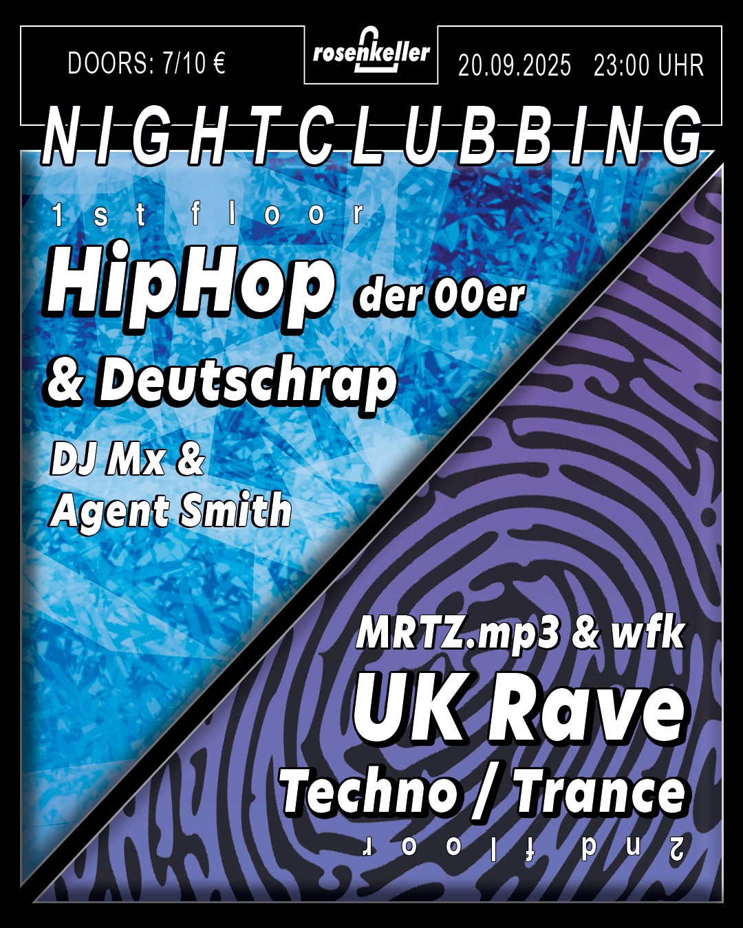 🪩Jeden Samstag Disko im Rosenkeller!🪩 1st floor: HipHop der 2000er & Deutschrap von DJ Mx & Agent Smith 2nd floor: UK Rave: Techno & Trance von MRTZ.mp3 & wfk Start: 23:00 UhrEintritt: 10€ / 7€ ErmäßigtP18 Wir freuen uns auf euch! 🌹 __________________________________________________________________ no antisemitism no racism no sexism no homohostile no ableism - NO HATE ... Weiterlesen |