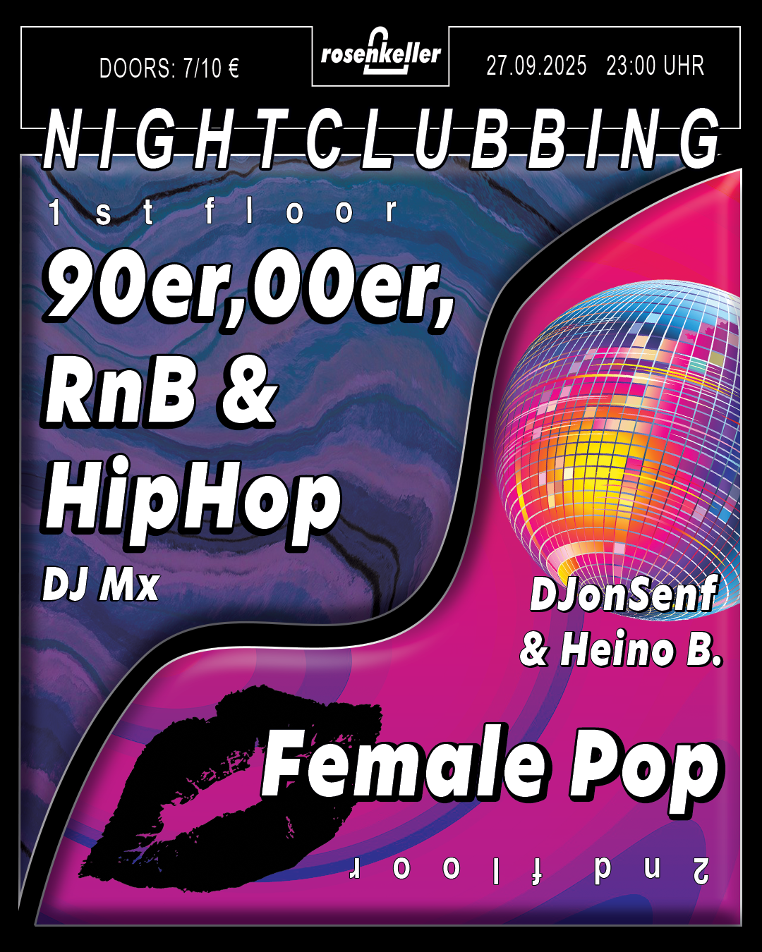 🪩Jeden Samstag Disko im Rosenkeller!🪩 1st floor: 90er, 00er, RnB & HipHop von DJ Mx 2nd floor: Female Pop von DJonSenf & Heino B. Start: 23:00 UhrEintritt: 10€ / 7€ ErmäßigtP18 Wir freuen uns auf euch! 🌹 __________________________________________________________________ no antisemitism no racism no sexism no homohostile no ableism - NO HATE __________________________________________________________________ 🪩Disco every Saturday in ... Weiterlesen |