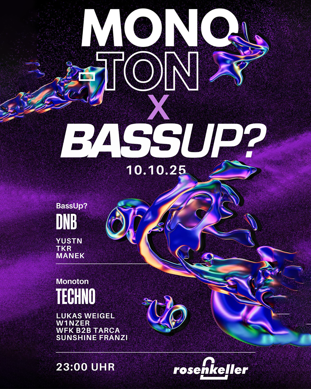 🎶 MONOTON x BASSUP? 🎶 Zwei Crews, zwei Floors, zwei Styles – eine Nacht voller Sound und Energie!Freut euch auf treibenden Techno im Monoton-Floor und fette Drum & Bass-Vibes bei BassUp?. 🔥 Line-UpBassUp? – DNB YUSTN (Kunstland/Muna) TKR (BassUp) Manek (AML) Monoton – Techno Lukas Weigel (Monoton/Breaking Beats) W1NZER (Monoton) WFK b2b Tarca (Monoton/Paraphora) Sunshine ... Weiterlesen |