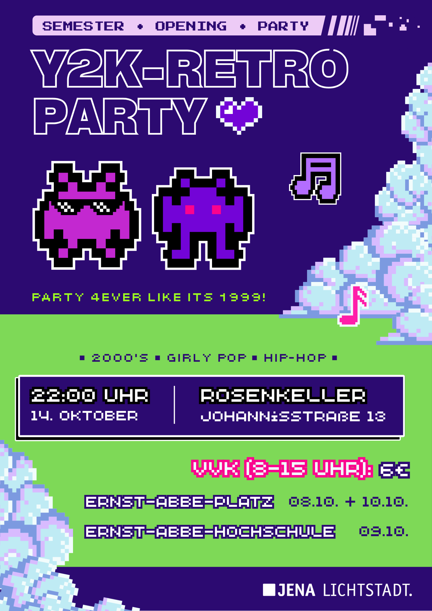✨ Y2K-Retro-Party – Semester Opening ✨ Party 4ever like it’s 1999! Zum Start ins Wintersemester feiern wir mit euch eine unvergessliche Nacht voller 2000’s Sound, Girly Pop & Hip-Hop Vibes – ganz im Y2K-Retro-Stil. 📍 Location: Rosenkeller Jena (Johannisstraße 13) 📅 Datum: Dienstag, 14. Oktober 2025 🕗 Einlass: ab 22:00 Uhr 🎶 Musik: 2000’s // ... Weiterlesen |