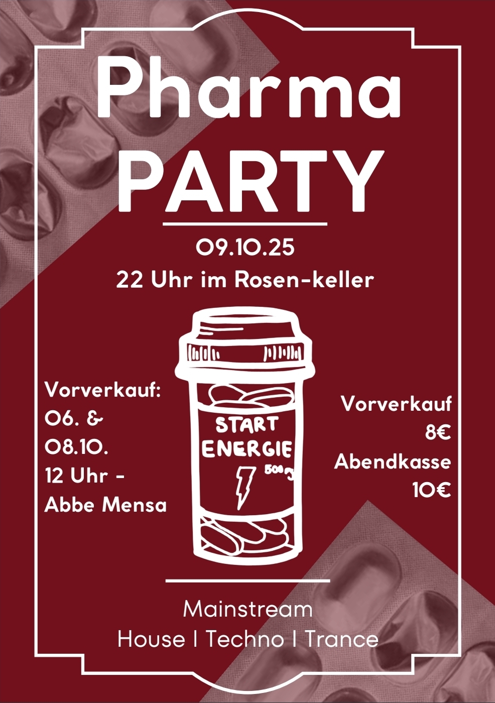🎉 STET Pharma Party 2025 🎉 Die Studieneinführungstage wären nicht komplett ohne sie: unsere legendäre Party im Rosenkeller! Am 09.10.25 ab 22 Uhr wird gefeiert, getanzt und angestoßen – mit den besten Sounds aus Mainstream, House, Techno & Trance. 🔊✨ 🎟 Tickets: VVK: 8€ (Verkauf am 06. und 08.10. jeweils 12-13 Uhr in der Abbe ... Weiterlesen |