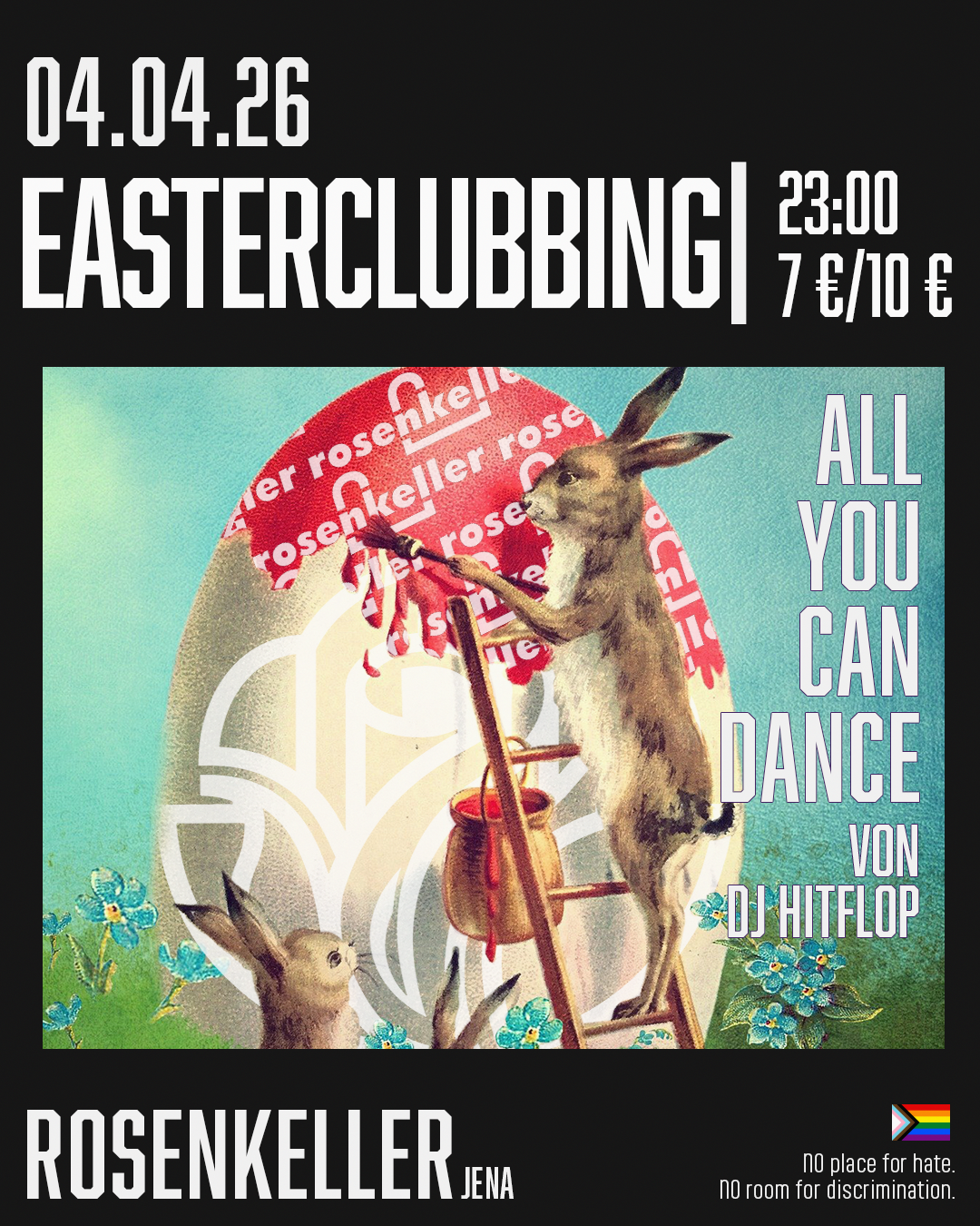 Am 4. April 2025 verwandelt sich der Rosenkeller Jena in ein wahres Osterparadies!🐣💃🕺 Freut euch auf beste Songs zum Tanzen und weitere Osterspecials! Start: 23:00 Uhr Eintritt: 10 € / 7 € ErmäßigtP18 – Ausweispflicht für alle! Wir freuen uns auf euch! 🐣🎉 __________________________________________________________________ no antisemitism no racism no sexism no homohostile no ableism – ... Weiterlesen |