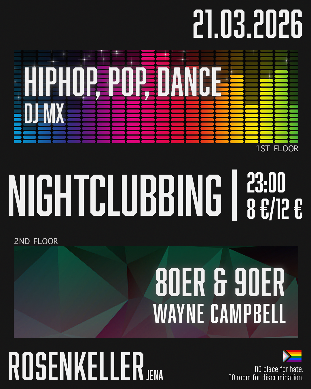 Jeden Samstag Disko im Rosenkeller! 1st floor: HipHop, Pop & Dance von DJ Mx2nd floor: 80er & 90er von Wayne Campbell Start: 23:00 UhrEintritt: 12 € / 8 € ErmäßigtP18 – Ausweispflicht für alle! Wir freuen uns auf euch! __________________________________________________________________ no antisemitism no racism no sexism no homohostile no ableism – NO HATE __________________________________________________________________ Disco ... Weiterlesen |