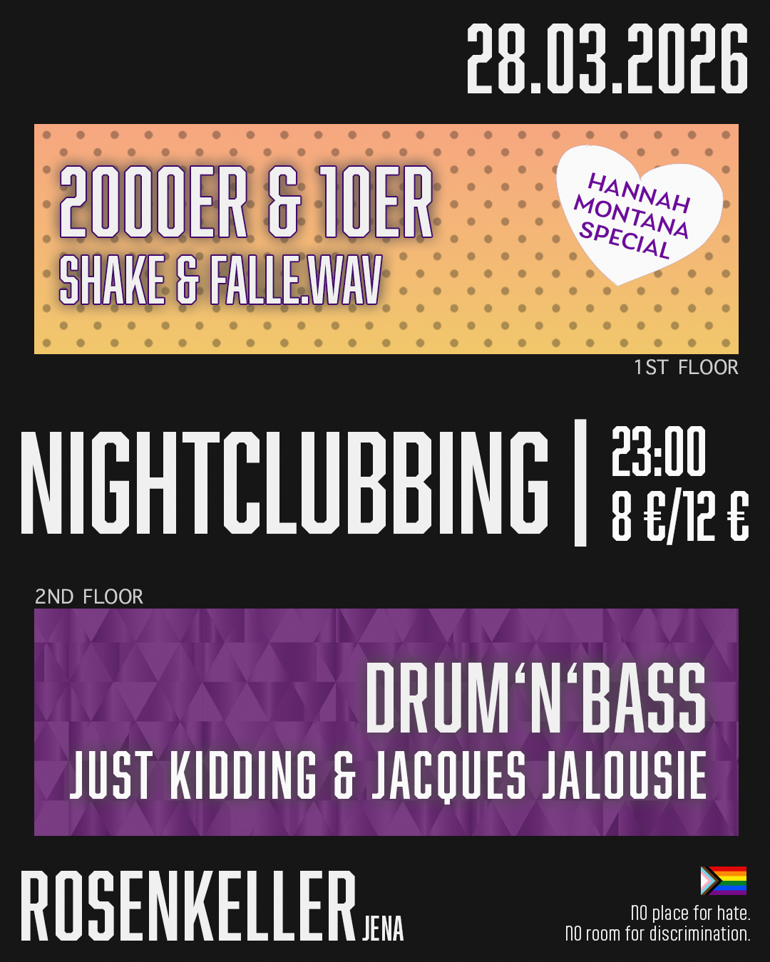 Jeden Samstag Disko im Rosenkeller! 1st floor: 2000er & 2010er - mit Hannah Montana Special von Shake & Falle.wav 2nd floor: Drum'n'Bass von Just Kidding & Jaques Jalousie Start: 23:00 UhrEintritt: 12 € / 8 € ErmäßigtP18 – Ausweispflicht für alle! Wir freuen uns auf euch! __________________________________________________________________ no antisemitism no racism no sexism no homohostile no ... Weiterlesen |