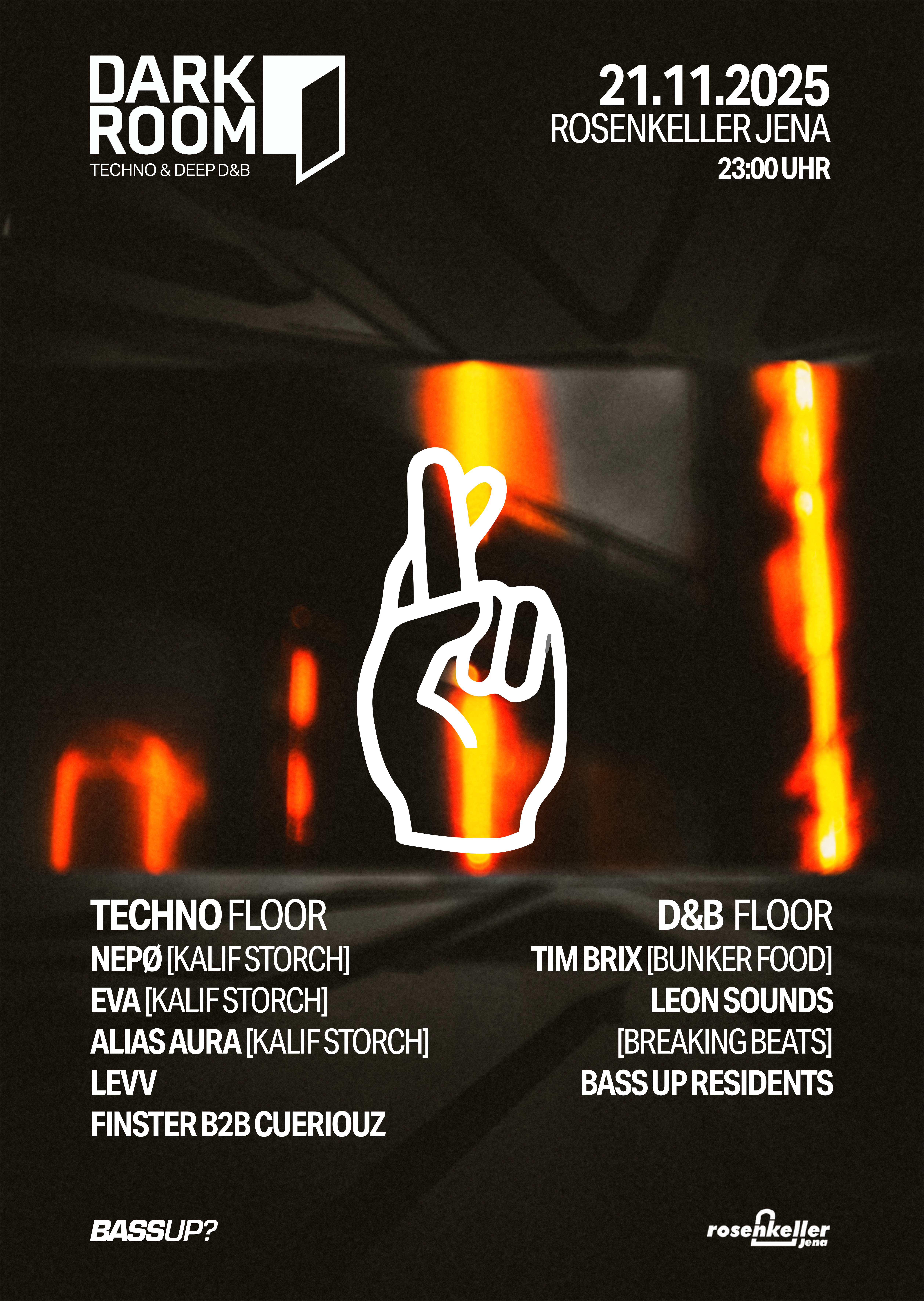 Rosenkeller Johannisstraße 13, Jena, Thüringen, DeutschlandDark Room meets Kalif Storch! 21.11.2025 | im Rosenkeller Jena Start: 23:00 Uhr TECHNO FLOOR NEPØ EVA ALIAS AURA LEVV FINSTER B2B CUERIOUZ D&B FLOOR TIM BRIX LEON SOUNDS BASS UP RESIDENTS
