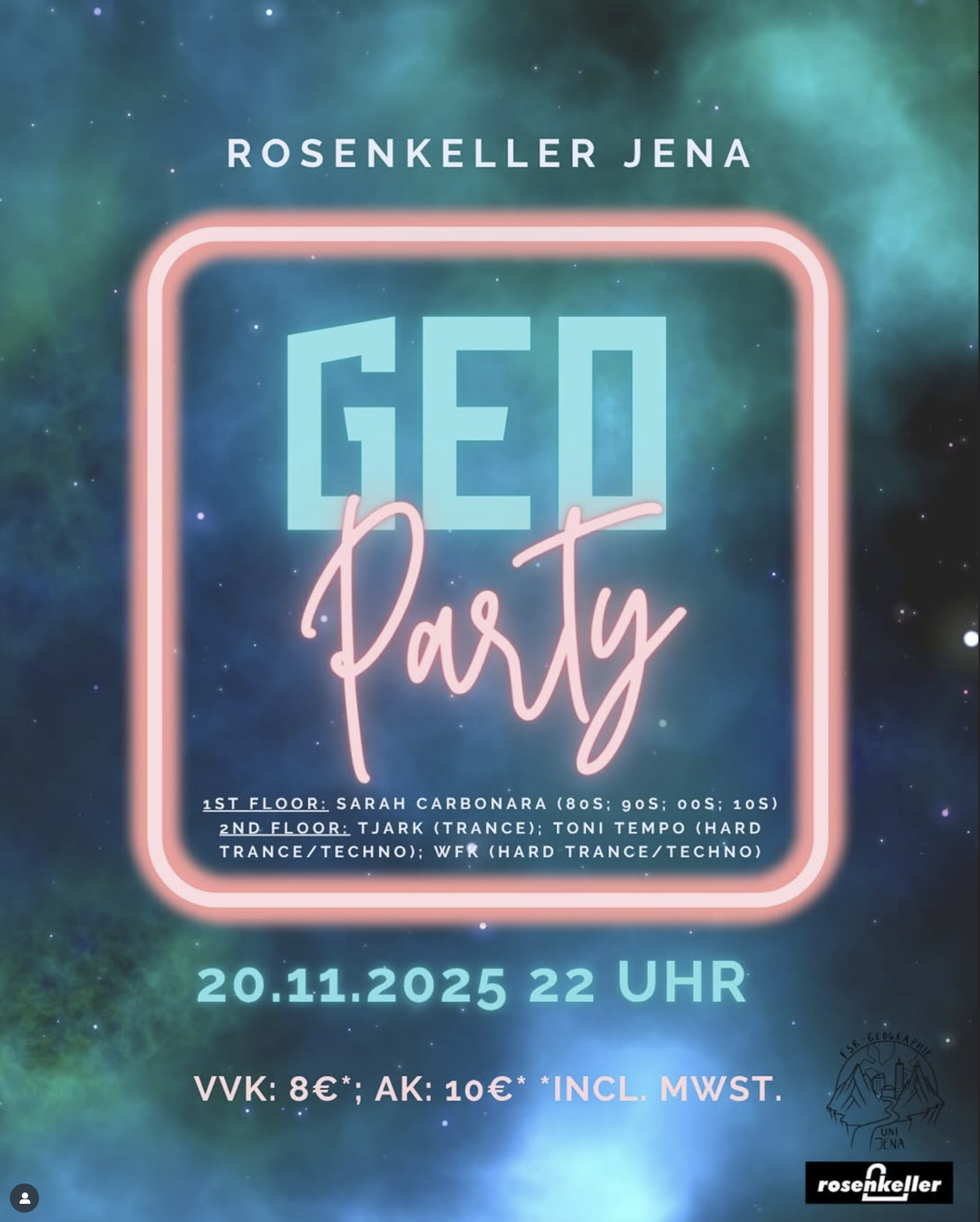 Rosenkeller Johannisstraße 13, Jena, Thüringen, Deutschland🥳 GEOPARTY SEMESTER-OPENING 🥳 Am 20.11.2025 ist es wieder soweit, wir wollen mit euch das neue Semester feiern! 🎉 Wie gewohnt wird auch diese Geoparty im Rosenkeller stattfinden. Einlass ist ab 22 Uhr und dann wird bis um 4 Uhr gefeiert. 👀 Karten könnt ihr im Vorverkauf oder an der Abendkasse kaufen. 🎟️ VVK-Termine (Foyer ... Weiterlesen