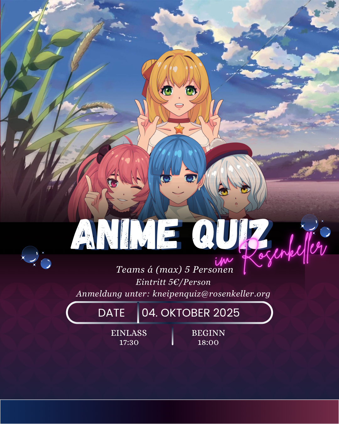 Am 01.11.2025 verwandelt sich unser und eurer Rosenkeller in eine schaurig-schöne Rätselkammer! Ab 17:30 Uhr ist Einlass, um 18:00 Uhr geht’s los – mit Fragen, bei denen selbst Frankenstein ins Schwitzen kommt. Schnapp dir dein Team (oder such dir spontan eins im Dunkeln 👀) und beweist, dass in euren Köpfen mehr steckt als nur Spinnweben. ... Weiterlesen |